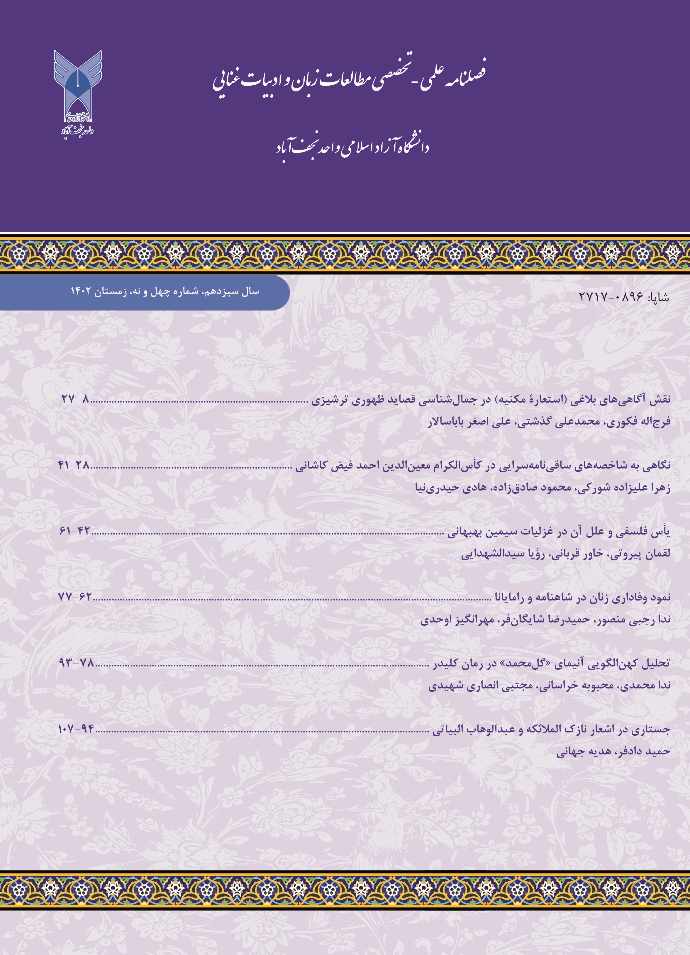 فهرست مقالات دسترسی آزاد مقاله صفحه چکیده متن کامل 1 - نقش آگاهیهای بلاغی (استعارۀ مکنیه) در جمالشناسی قصاید ظهوری ترشیزی فرج اله فکوری محمد علی گذشتی علی اصغر باباسالار 10.71594/lyriclit.2024.979921 دسترسی آزاد مقاله صفحه چکیده متن کامل 2 - بررسی ساقینامه و وجوه مشترک آن در اشعار معینالدین احمد با شعر شاعران منتخب در نسخة کأسالکرام زهرا علیزاده شورکی محمود صادق زاده هادی حیدرینیا 10.71594/lyriclit.2024.1106523 دسترسی آزاد مقاله صفحه چکیده متن کامل 3 - يأس فلسفي و علل آن در غزليات سيمين بهبهاني لقمان پیروتی خاور قربانی رؤیا سیدالشهدایی 10.71594/lyriclit.2024.1118965 دسترسی آزاد مقاله صفحه چکیده متن کامل 4 - نمود وفاداری زنان در دو اثر ادبی و کلاسیک جهانی شاهنامه و رامایانا ندا رجبی منصور حمید رضا شایگانفر مهرانگیز اوحدی 10.71594/lyriclit.2024.979918 دسترسی آزاد مقاله صفحه چکیده متن کامل 5 - تحلیل کهنالگویی آنیمای «گلمحمد» در رمان کلیدر ندا محمدی محبوبه خراسانی مجتبی انصاری 10.71594/lyriclit.2024.979889 دسترسی آزاد مقاله صفحه چکیده متن کامل 6 - جستاری در اشعار نازک الملائکه و عبدالوهاب البیاتی حمید دادفر هدیه جهانی 10.71594/lyriclit.2024.979884