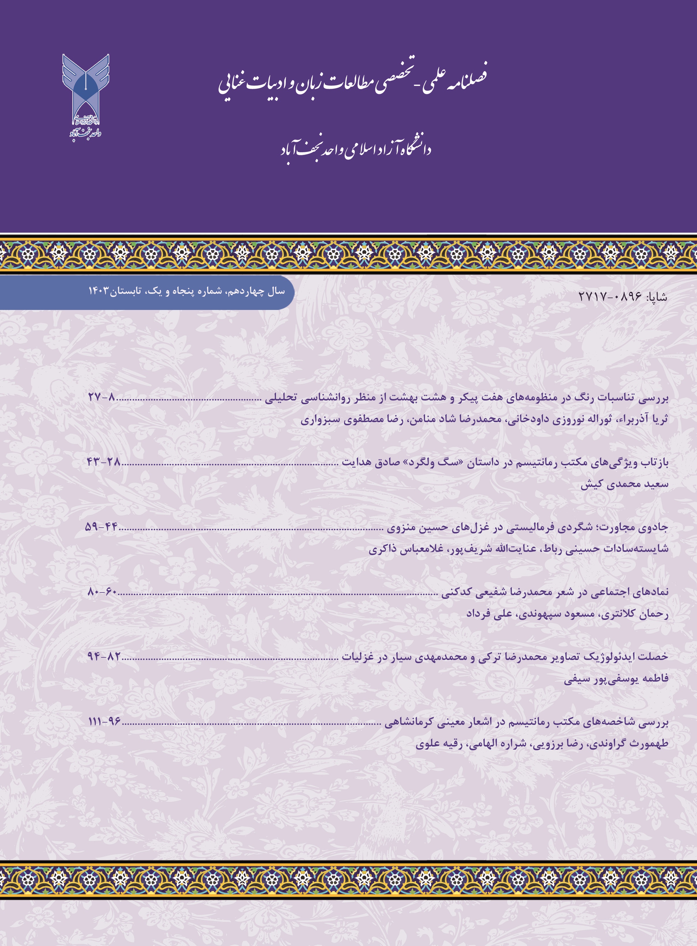 فهرست مقالات دسترسی آزاد مقاله صفحه چکیده متن کامل 1 - بررسی تناسبات رنگ در منظومههای هفت پیکر و هشت بهشت از منظر روانشناسی تحلیلی ثریا آذربرا ثوراله نوروزی داودخانی محمدرضا شادمنامن رضا مصطفوی سبزواری 10.71594/lyriclit.2024.1128793 دسترسی آزاد مقاله صفحه چکیده متن کامل 2 - بازتاب ویژگیهای مکتب رمانتیسم در داستان «سگ ولگرد» صادق هدایت سعید محمدی کیش 10.71594/lyriclit.2024.979904 دسترسی آزاد مقاله صفحه چکیده متن کامل 3 - جادوی مجاورت؛ شگردی فرمالیستی در غزلهای حسین منزوی شایسته سادات حسینی رباط عنایت الله شریف پور غلامعباس ذاکری 10.71594/lyriclit.2024.1120286 دسترسی آزاد مقاله صفحه چکیده متن کامل 4 - نمادهای اجتماعی در شعر محمدرضا شفیعی کدکنی رحمان کلانتری مسعود سپهوندی علی فرداد 10.71594/lyriclit.2024.1192271 دسترسی آزاد مقاله صفحه چکیده متن کامل 5 - خصلت ایدئولوژیک تصاویر محمدرضا ترکی و محمدمهدی سیار در غزلیات فاطمه یوسفپور سیفی 10.71594/lyriclit.2024.979924 دسترسی آزاد مقاله صفحه چکیده متن کامل 6 - بررسی شاخصههای مکتب رمانتیسم در اشعار معینی کرمانشاهی طهمورث گراوندی رضا برزویی شراره الهامی رقیه علوی 10.71594/LYRICLIT.2024.1121397
