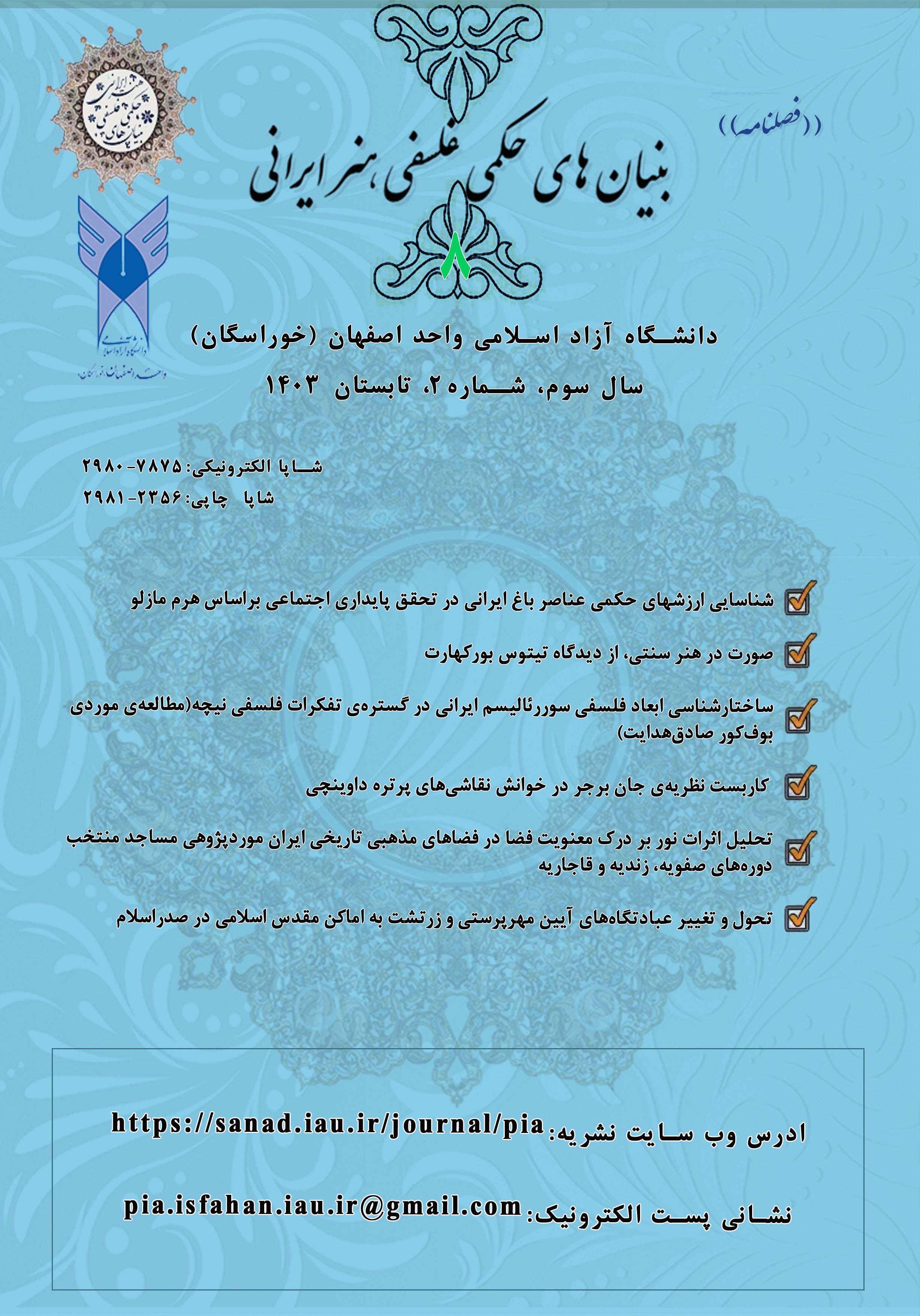 فهرست مقالات دسترسی آزاد مقاله صفحه چکیده متن کامل 1 - شناسایی ارزشهای حکمی عناصر باغ ایرانی در تحقق پایداری اجتماعی براساس هرم مازلو پریسا زارعان دولت آبادی عبدالله جبل عاملی 10.30486/PIA.2024.140302181119246 دسترسی آزاد مقاله صفحه چکیده متن کامل 2 - صورت در هنر سنتی، از دیدگاه تیتوس بورکهارت سیده محبوبه مقیم نژادحسینی 10.30486/PIA.2024.140303021120488 دسترسی آزاد مقاله صفحه چکیده متن کامل 3 - ساختارشناسی ابعاد فلسفی سوررئالیسم ایرانی در گسترهی تفکرات فلسفی نیچه (مطالعهی موردی بوفکور صادقهدایت) مهدی محمدخانی محمد لطیفی 10.30486/PIA.2024. 140305071127464 دسترسی آزاد مقاله صفحه چکیده متن کامل 4 - کاربست نظریهی جان برجر در خوانش نقاشیهای پرتره داوینچی مجتبی بهرامی پور شیدا نصیری 10.30486/PIA.2024.140305091127648 دسترسی آزاد مقاله صفحه چکیده متن کامل 5 - تحلیل اثرات نور بر درک معنویت فضا در فضاهای مذهبی تاریخی ایران موردپژوهی مساجد منتخب دورههای صفویه، زندیه و قاجاریه نگار رضایی لیلا زارع 10.30486/PIA.2024.140303191122136 دسترسی آزاد مقاله صفحه چکیده متن کامل 6 - تحول و تغییر عبادتگاههای آیین مهرپرستی و زرتشت به اماکن مقدس اسلامی در صدراسلام صبا حسین پور لیدا بلیلان اصل 10.30486/PIA.2024.2401-1075