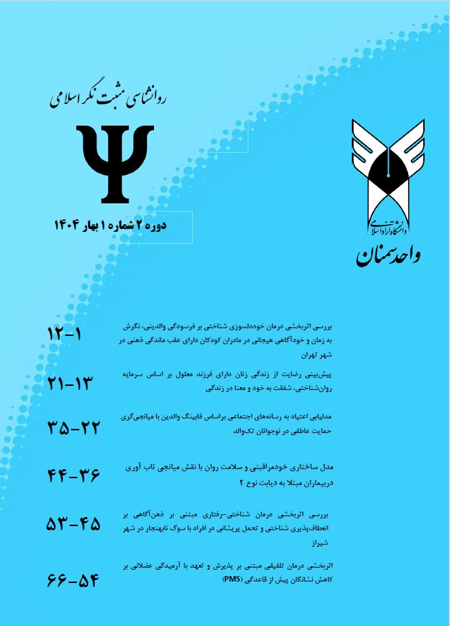 فهرست مقالات پروانه صفدریان دسترسی آزاد مقاله صفحه چکیده متن کامل 1 - بررسی اثربخشی درمان خوددلسوزی شناختی بر فرسودگی والدینی، نگرش به زمان و خودآگاهی هیجانی در مادران کودکان دارای عقب ماندگی ذهنی در شهر تهران پروانه صفدریان فرزانه احمدی محمدرضا رسولی نژآد عاطفه میراحمدی دسترسی آزاد مقاله صفحه چکیده متن کامل 2 - اثربخشی آموزش راه حل مدار بر کاهش تکانشگری، تاب آوری و بهزیستی اجتماعی مادران دانش آموزان مقطع ابتدایی آموزش و پرورش منطقه 3 شهر تهران پروانه صفدریان فرزانه احمدی