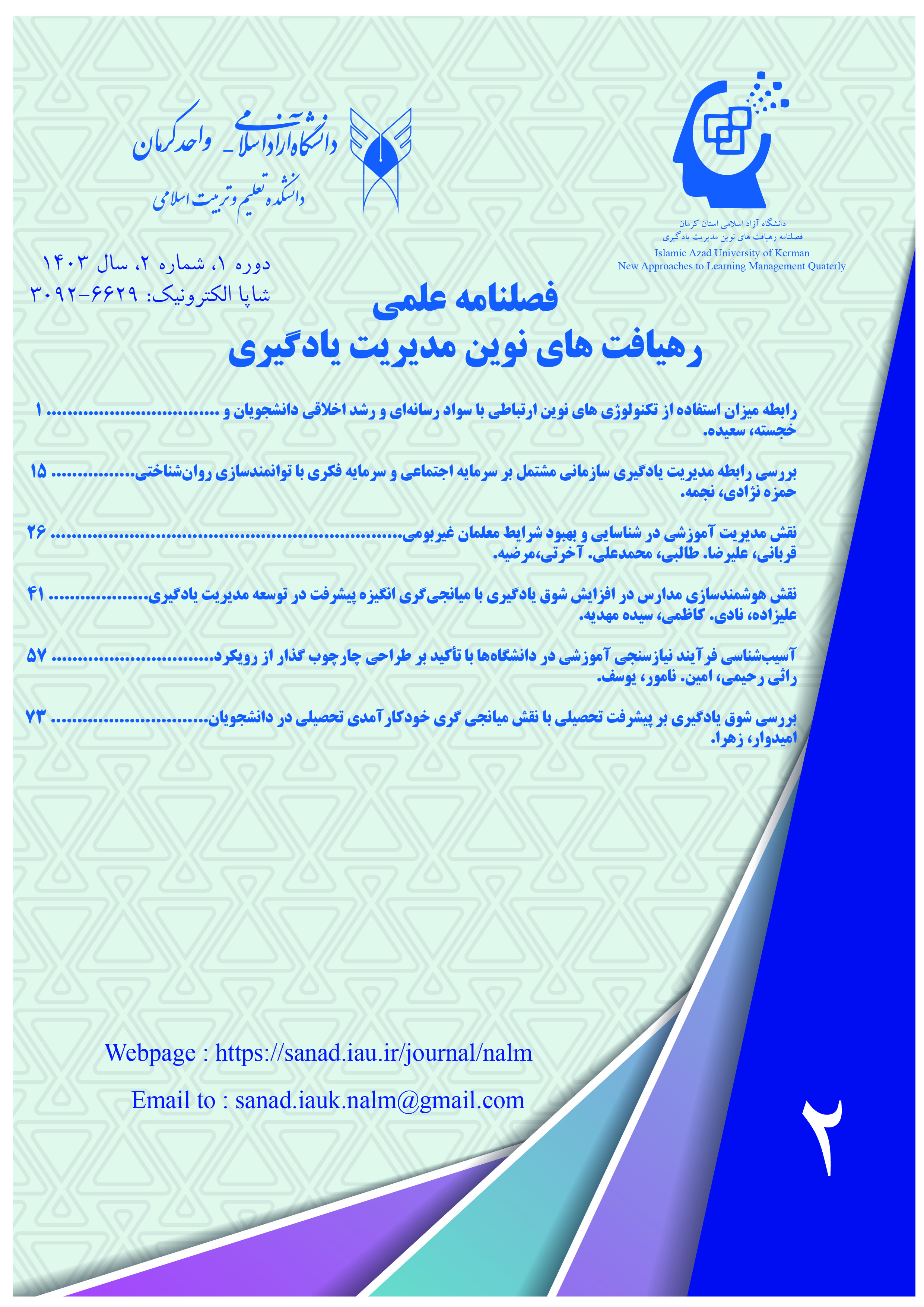 فهرست مقالات دسترسی آزاد مقاله صفحه چکیده متن کامل 1 - رابطه میزان استفاده از تکنولوژی های نوین ارتباطی با سواد رسانهای و رشد اخلاقی دانشجویان و اعضای هیات علمی دانشگاه پیام نور کرمان سعیده خجسته دسترسی آزاد مقاله صفحه چکیده متن کامل 2 - بررسی رابطه مدیریت یادگیری سازمانی مشتمل بر سرمایه اجتماعی و سرمایه فکری با توانمندسازی روانشناختی معلمان زن مقطع دوره دوم متوسطه نجمه حمزه نژادی دسترسی آزاد مقاله صفحه چکیده متن کامل 3 - نقش مدیریت آموزشی در شناسایی و بهبود شرایط معلمان غیربومی مرضیه آخرتی علیرضا قربانی محمدعلی طالبی دسترسی آزاد مقاله صفحه چکیده متن کامل 4 - نقش هوشمندسازی مدارس در افزایش شوق یادگیری با میانجیگری انگیزه پیشرفت در توسعه مدیریت یادگیری نادی علیزاده سید مهدیه کاظمی دسترسی آزاد مقاله صفحه چکیده متن کامل 5 - آسیبشناسی فرآیند نیازسنجی آموزشی در دانشگاهها با تأکید بر طراحی چارچوب گذار از رویکردهای سنتی به رویکرد دادهمحور امین راثی رحیمی یوسف نامور دسترسی آزاد مقاله صفحه چکیده متن کامل 6 - بررسی شوق یادگیری بر پیشرفت تحصیلی با نقش میانجی گری خودکارآمدی تحصیلی در دانشجویان مقطع کارشناسی ارشد روانشناسی دانشگاه آزاد اسلامی واحد شیراز زهرا امیدوار