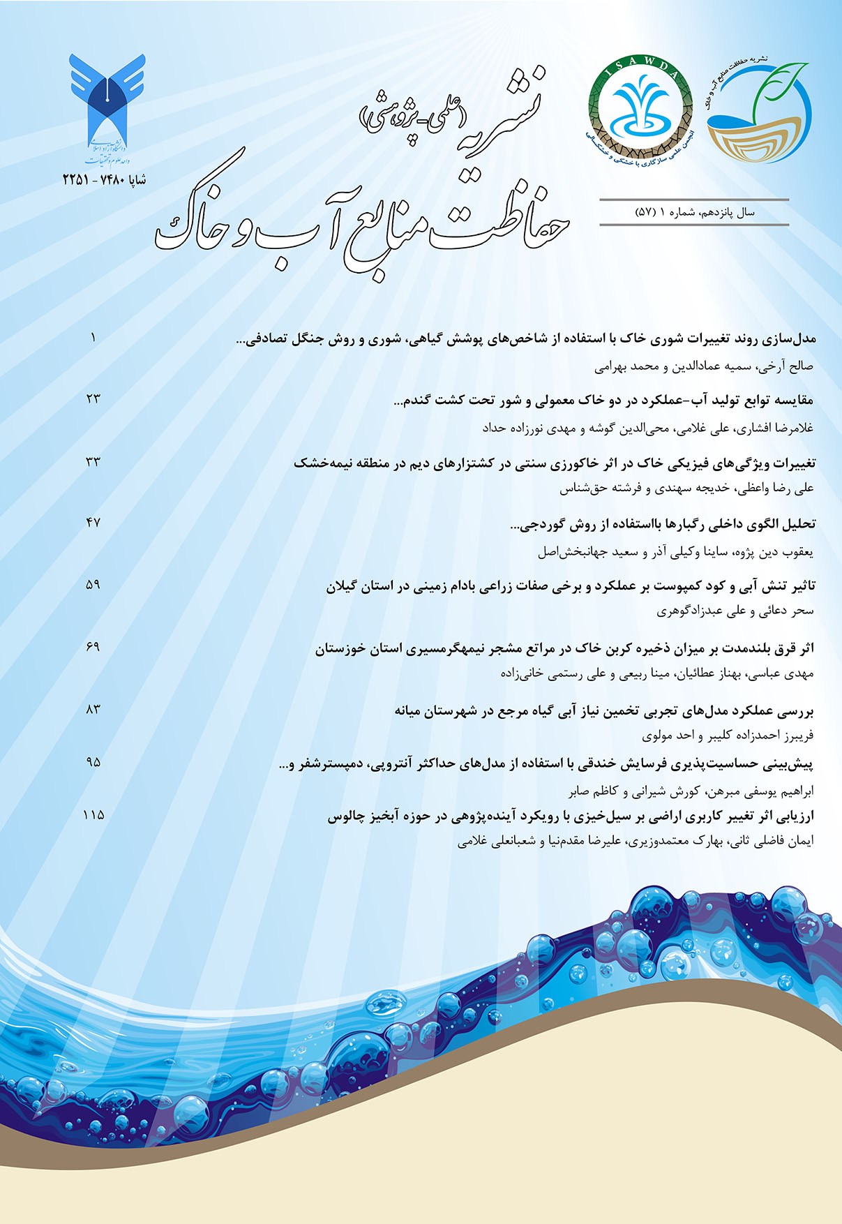 فهرست مقالات دسترسی آزاد مقاله صفحه چکیده متن کامل 1 - مدلسازي روند تغييرات شوري خاک با استفاده از شاخصهاي پوشش گياهي، شوري و روش جنگل تصادفي (مطالعه موردي: شهرستان گميشان، استان گلستان) صالح آرخی سمیه عمادالدین محمد بهرامی دسترسی آزاد مقاله صفحه چکیده متن کامل 2 - مقايسه توابع توليد آب-عملکرد در دو خاک معمولي و شور تحت کشت گندم (مطالعه موردي: استان خوزستان) غلامرضا افشاری علی غلامی محی الدین گوشه مهدی نورزاده حداد دسترسی آزاد مقاله صفحه چکیده متن کامل 3 - تغييرات ويژگيهاي فيزيکي خاک در اثر خاکورزي سنتي در کشتزارهاي ديم در منطقه نيمهخشک علی رضا واعظی خدیجه سهندی فرشته حق شناس دسترسی آزاد مقاله صفحه چکیده متن کامل 4 - تحليل الگوي داخلي رگبارها بااستفاده از روش گوردجي (مطالعه موردي: استان گلستان) یعقوب دین پژوه ساینا وکیلی آذر سعید جهانبخش اصل دسترسی آزاد مقاله صفحه چکیده متن کامل 5 - تاثير تنش آبي و کود کمپوست بر عملکرد و برخي صفات زراعي بادام زميني در استان گيلان سحر دعائی علی عبدزادگوهری دسترسی آزاد مقاله صفحه چکیده متن کامل 6 - اثر قرق بلندمدت بر میزان ذخیره کربن خاک در مراتع مشجر نیمه گرمسیری استان خوزستان مهدی عباسی بهناز عطائيان مينا ربيعي علی رستمی خانی زاده دسترسی آزاد مقاله صفحه چکیده متن کامل 7 - بررسی عملکرد مدلهای تجربی تخمین نیاز آبی گیاه مرجع در شهرستان میانه فریبرز احمدزاده کلیبر احد مولوی دسترسی آزاد مقاله صفحه چکیده متن کامل 8 - پيشبيني حساسيتپذيري فرسايش خندقي با استفاده از مدلهاي حداکثر آنتروپي، دمپسترشفر و وزن شاهد در دامنهي جنوبي البرز: تعيين بهترين مدل و تأثير مهمترين شاخصها ابراهیم یوسفی مبرهن کورش شیرانی کاظم صابر دسترسی آزاد مقاله صفحه چکیده متن کامل 9 - ارزيابي اثر تغيير کاربري اراضي بر سيلخيزي با رويکرد آيندهپژوهي در حوزه آبخيز چالوس ایمان فاضلی ثانی بهارک معتمدوزیری علیرضا مقدم نیا شعبانعلی غلامی